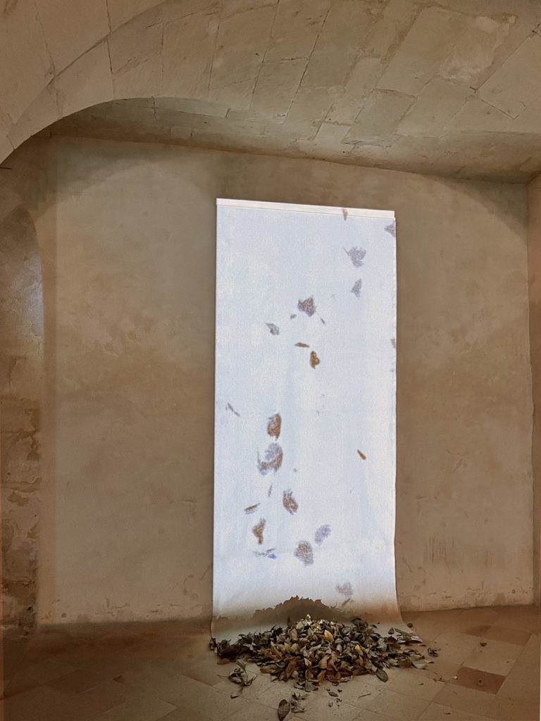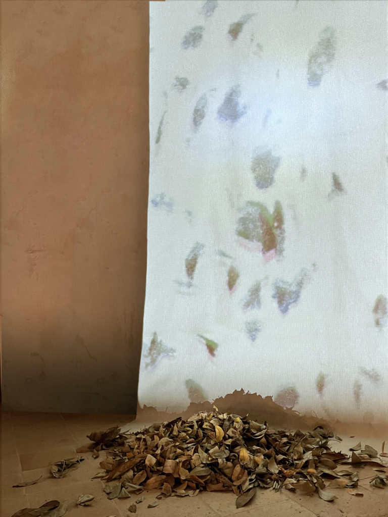 Plusieurs éléments sèment le trouble dans cette classique représentation automnale ; la représentation des feuilles est minimaliste, le spectateur observe davantage des ombres imprimées sur un voile qu’une habituelle scène bucolique ; par ailleurs, la danse végétale s’opère sur un support étiré en hauteur, en opposition avec le format paysage généralement utilisé pour représenter les scènes de nature. Enfin, la temporalité de cette chorégraphie aléatoire est inversée.